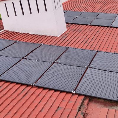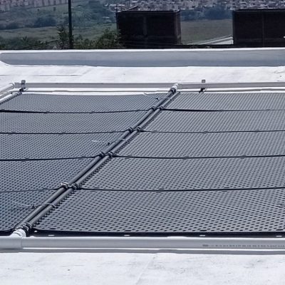 Sistema llave en mano para la instalación de un sistema de calefacción solar para alberca techada, compuesto por 40 colectores solares fabricados en Alemania, incluyendo control solar touch y timer.