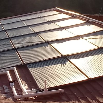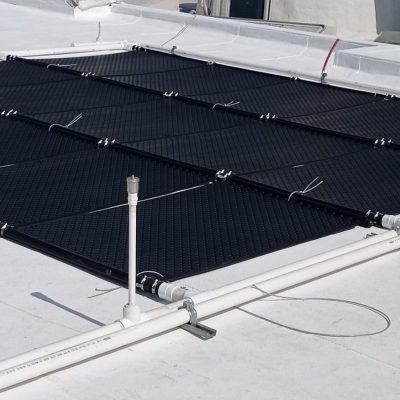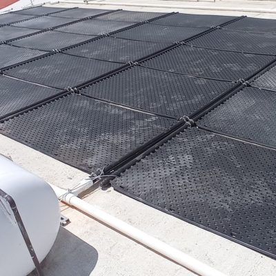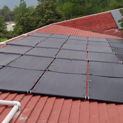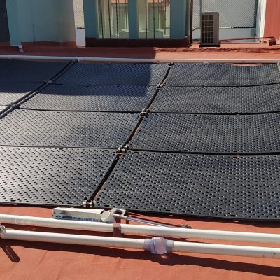 Sistema llave en mano para calefacción solar de una piscina, incluye 49 colectores solares y controlador de temperatura diferencial.